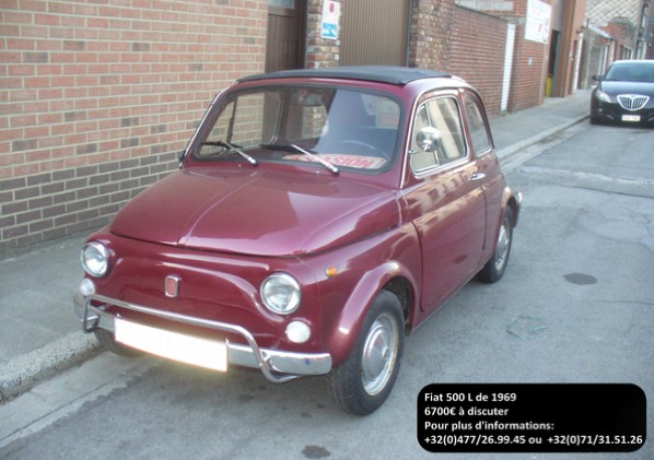 Fiat 500L-1968.Tout d'origine.Import d'Italie.3em propriétaire.Possede plaquette d'identification Fiat.Papiers belges.Intérieur bon état (usure normale pas de coupure): sellerie noire,capote,ceintures à l'avant,tableau de bord avec cadrant rectangulaire.Visible à froidchapelle.Propriétaire à nam